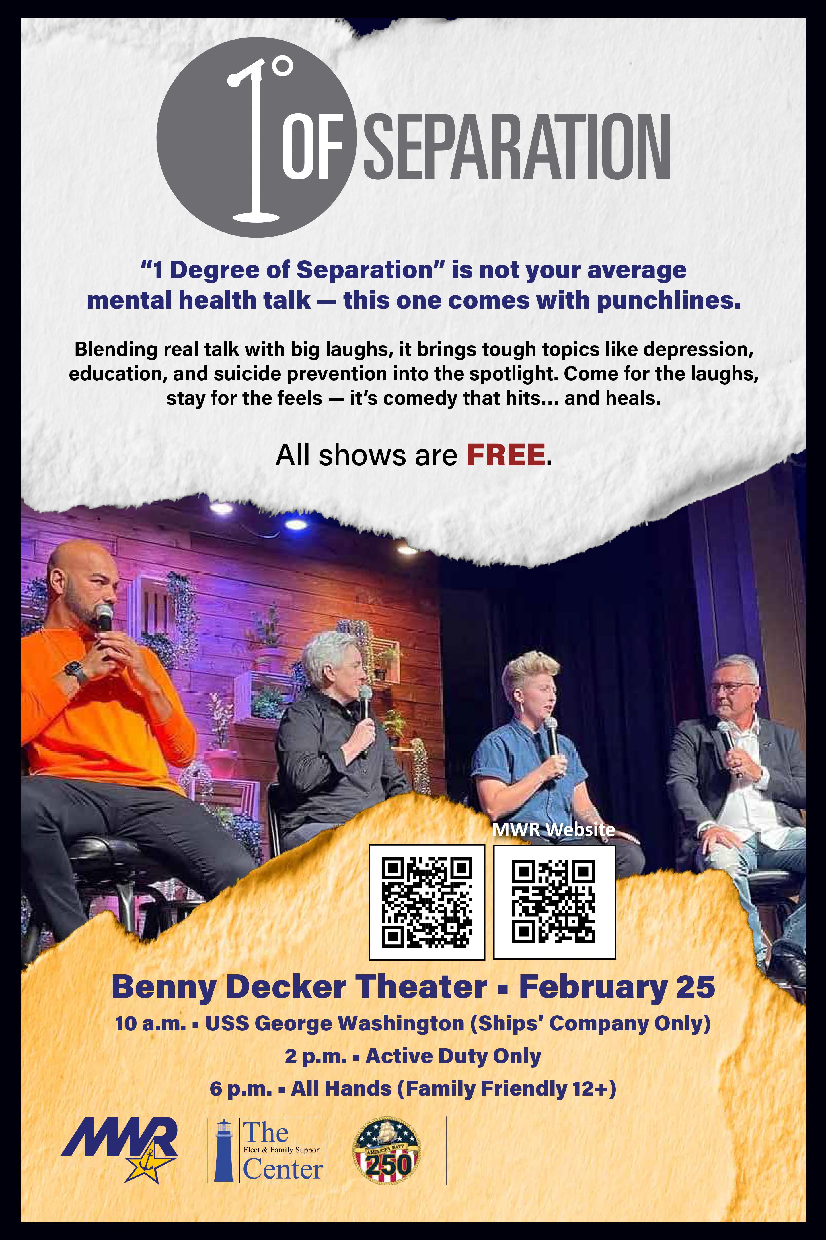 "1 Degree of Separation" is not your average mental health talk - this one comes with punchlines. Blending real talk with big laughs, it brings tough topics like depression, education, and suicide prevention into the spotlight. Come for the laughs, stay for the feels - it's comedy that hits...and heals. All shows are free.
