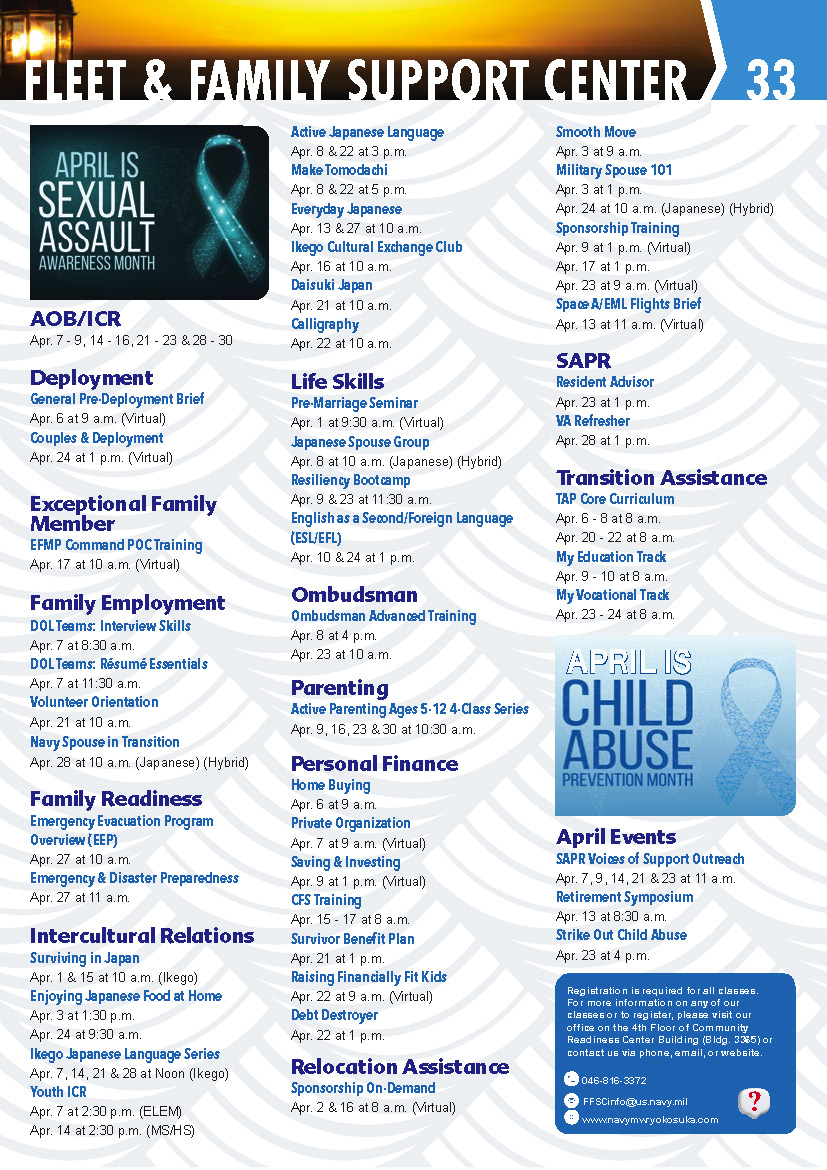 To prepare for the possibility of an evacuation, join our workshop to discuss the MANDATORY USFJ Emergency Evacuation Program (EEP) checklist and packet and what to do with it.